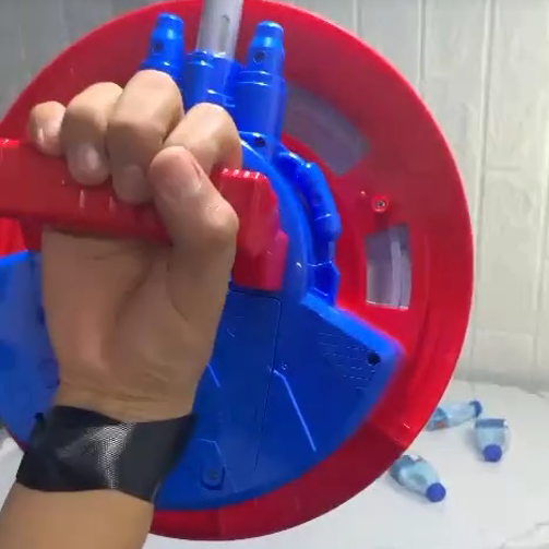 El escudo cuenta con un compartimento interno donde se cargan los balines de hidrogel.